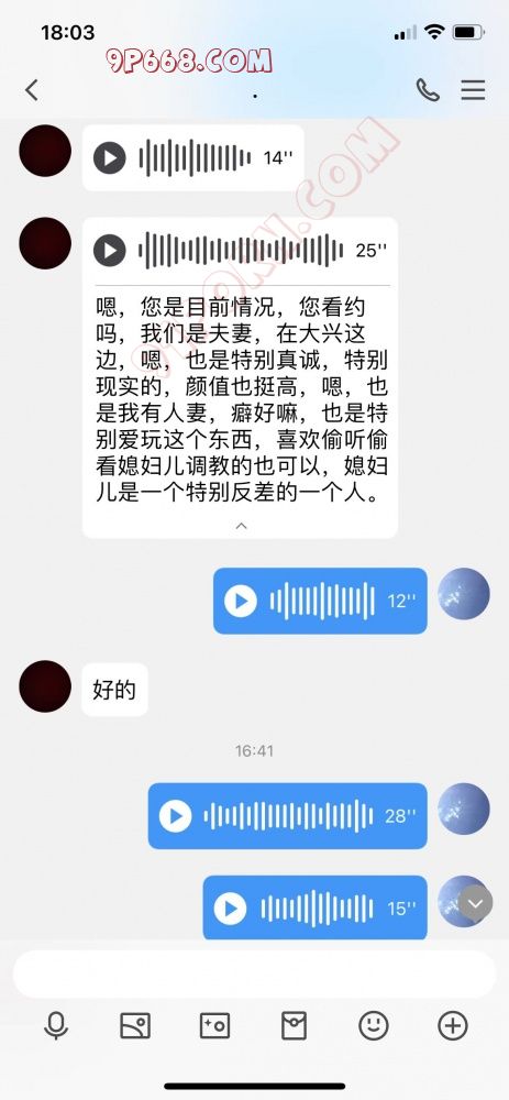 然后也懒得打字了,就语音了几句,他也语音过来了,我还觉得挺真诚,然后就直接说自己是淫妻啥的,具体的看聊天内容;然后我去买菜,回来闲扯了几句,问他是绿帽还是淫妻,他自己也不清楚,就说喜欢偷看,偷听;